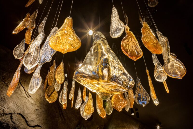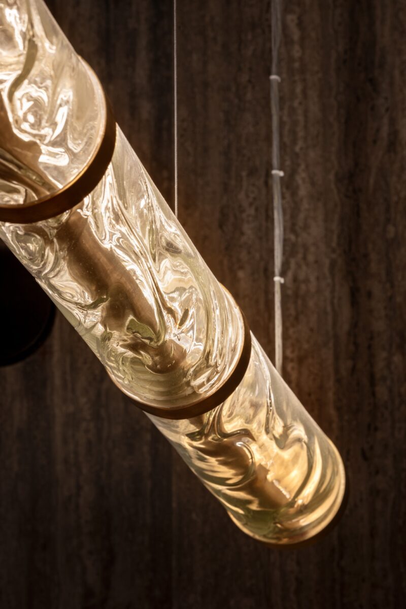 Другим виразним артоб’єктом стала каустична «сигара» — скляна колба з двома незалежними джерелами світла. Усередині формується ефект рухомого диму, який створює хвилеподібні світлові відблиски на стінах і стелі. Малюнок постійно змінюється залежно від часу доби та освітлення.