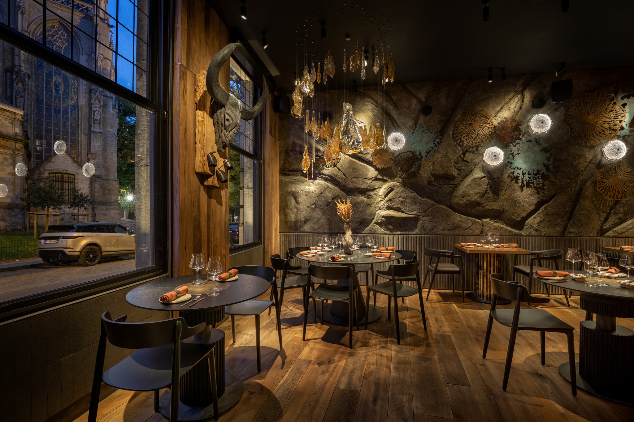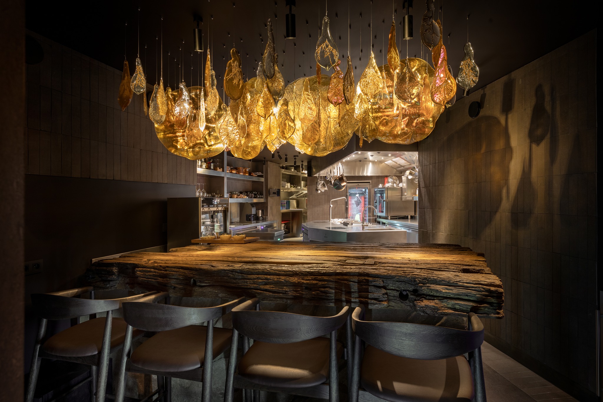 Для простору з містичною концепцією автори створили індивідуальну систему освітлення та унікальні кастомні артоб’єкти. Ключовими елементами інтер’єру стали дві авторські світло-скляні скульптури, виготовлені у склодувній майстерні Optical Metaphor.