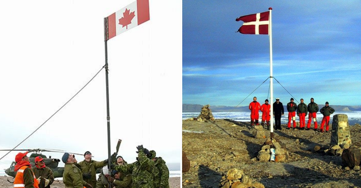 І Канада, і Данія знаходяться на відстані 18 км від острова Ганса, що дозволяє їм претендувати на скелю згідно з міжнародним правом. У 1973 році канадський уряд вирішив відкрито заявити про намір залишити острів собі, тому відправив туди свої війська, аби встановити прапор.