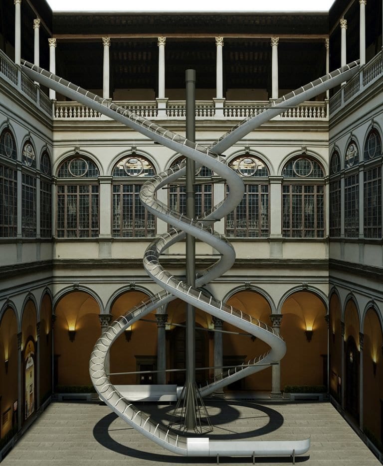 Доктор биологии и художник Карстен Хёллер, который знаменит своими интерактивными инсталляциями, установит во дворе ренессансного палаццо две спиралевидные горки, с которых посетители смогут съезжать вниз с верхней террасы. Перед спуском – каждый из гостей возьмет в руки горшок с растением, который затем заберут в лабораторию, где изучат, как именно повлияли на цветок стремительный съезд по 20-метровой трубе и эмоции человека.