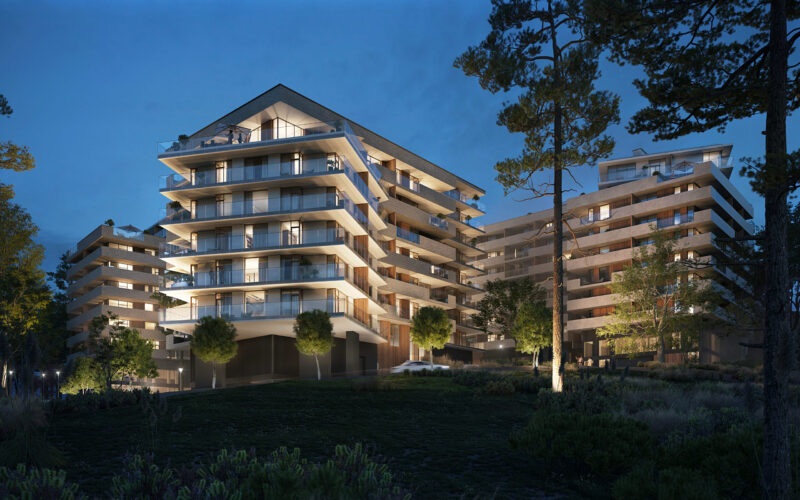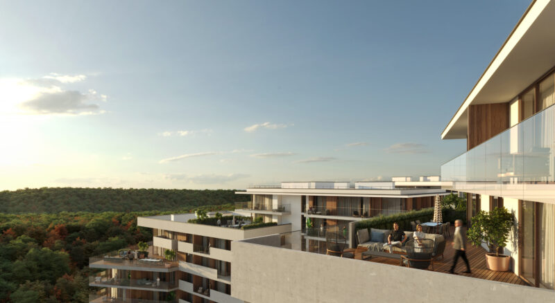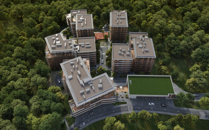 Житловий ансамбль на складному рельєфі з перепадом в 40 метрів. Це приклад того, як архітектура не бореться зі схилом, а використовує його для створення приватних терас за рахунок каскадної забудови і панорамних видів на Винниківський лісопарк.