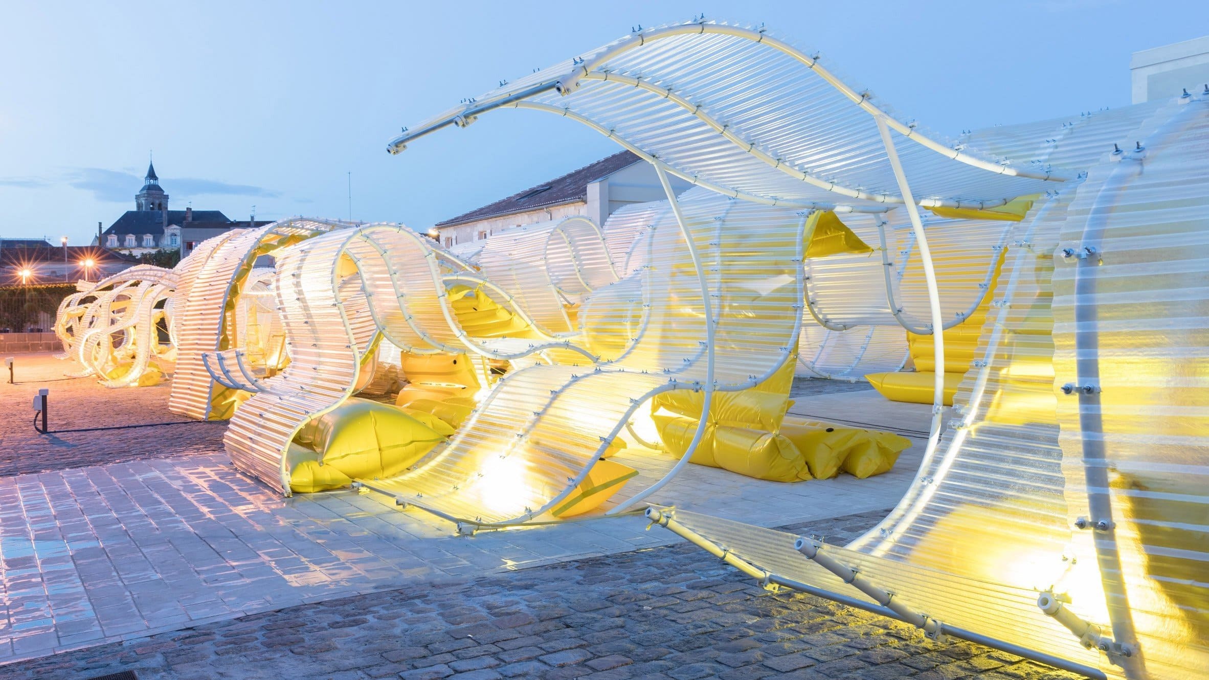 Созданная для Триеннале в Брюгге туннелеобразная структура с прозрачной розово-оранжевой пластиковой оболочкой поверх стального каркаса – позволяет посетителям даже в хмурый день «почувствовать солнце внутри павильона», говорят Хосе и Люси. А в центре ярко-желтой палубы прорезан эллипсовидный бассейн, в котором, если погода, напротив, жаркая, можно искупаться.