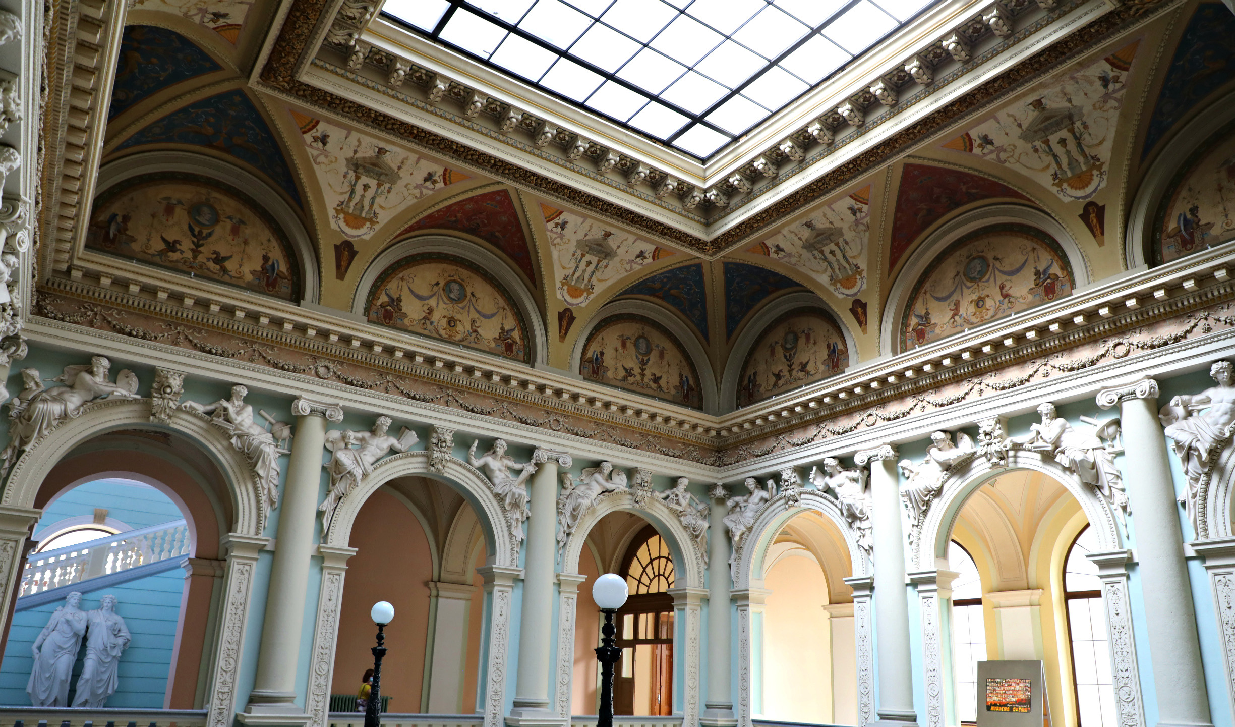 “Єдина в Україні актова зала університету збережена в автентичному вигляді ― такою ж, якою була понад століття тому. Вона вражає унікальним інтер’єром ХІХ ст.: багатством малярства і скульптури. Окрасою зали є картини, створені за ескізами видатного художника Яна Матейка “Тріумф прогресу”, які є дарунком імператора Франца Йосифа I”, — пишуть на сайті політехніки.