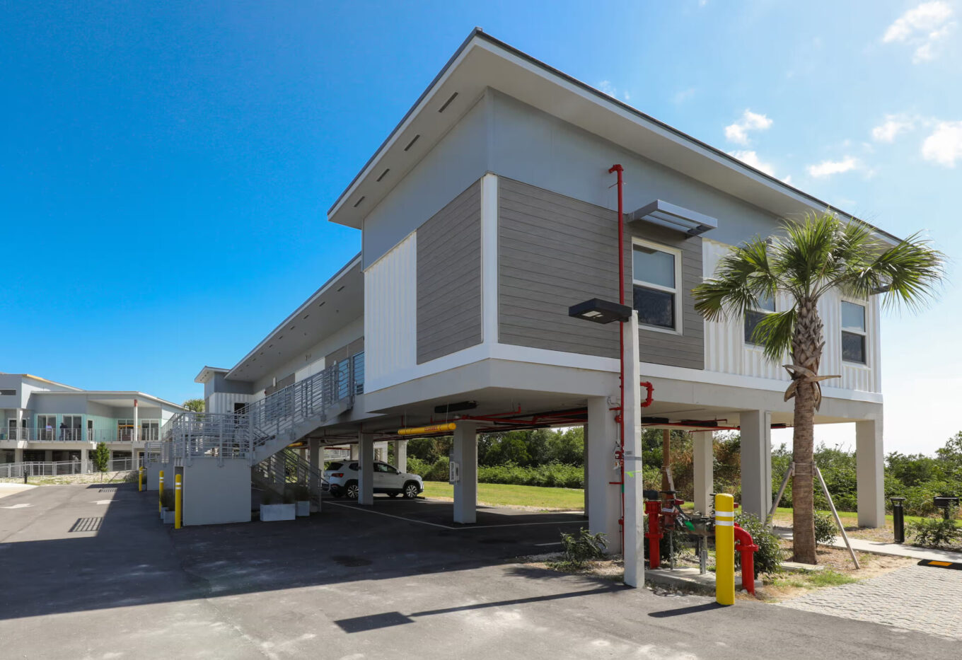 Flamingo Lodge зведено на бетонних палях заввишки понад 4 метри, аби витримати майбутні шторми та повені. Він замінив старий готель 1960-х років, зруйнований ураганами Катріна та Вілма. Новий комплекс має 24 номери, ресторан і бар — усе у чотирьох компактних кластерах, створених із контейнерів, піднятих над землею, пише The Guardian.