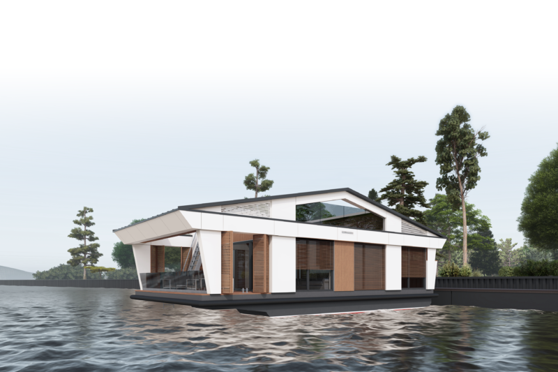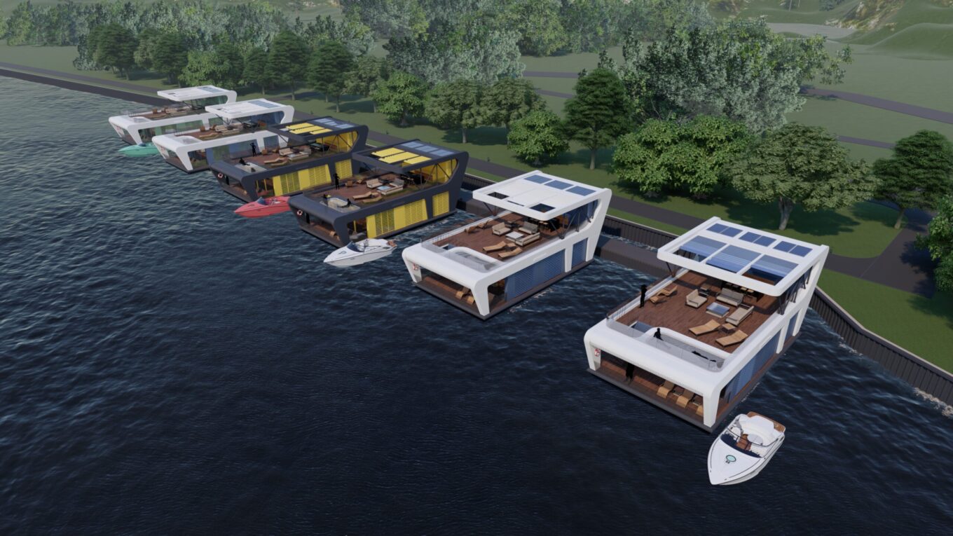 Втім, мобільні будинки можуть розташовуватися і на воді. У цьому разі, окрім самого будинку, необхідно збудувати понтон, поєднати всі елементи на місці та підключити їх до комунікацій.