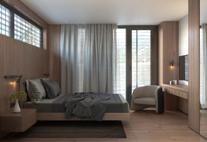 Інтер’єр будинку оформлений високоякісними екологічними панелями із закругленими краями, які повністю приховують елементи каркасного з’єднання. Усі меблі, сантехніка, оздоблення та декор не мають гострих кутів, що є важливим для безпеки в будівлях такого типу.