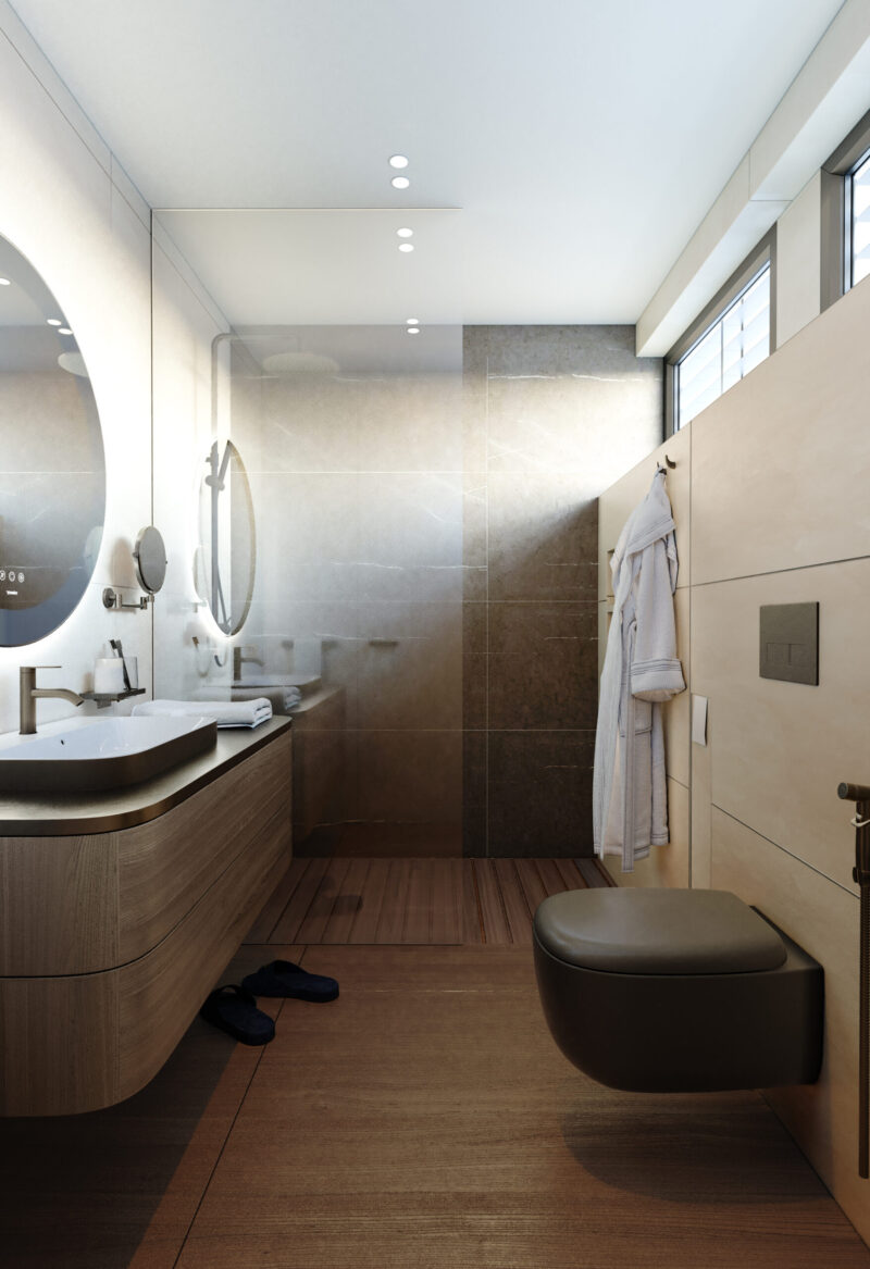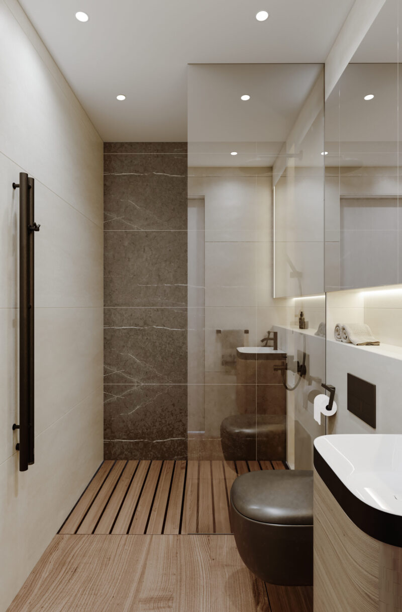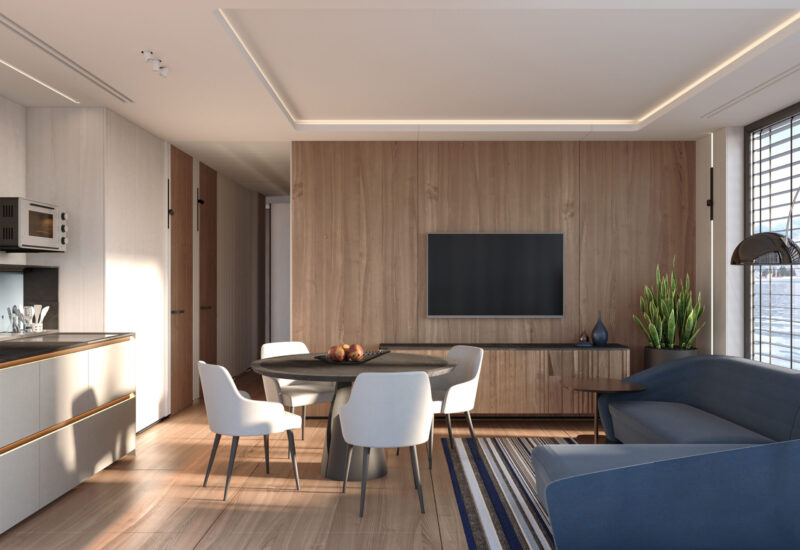 Вбудоване освітлення є лаконічним, що підкреслює сучасний стиль інтер’єру. Глибокий синій колір виступає акцентним на фоні білого, створюючи асоціацію з водною гладдю. Дерев’яні елементи додають простору елегантності та респектабельності.