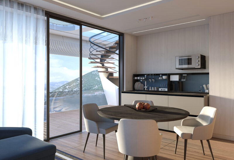 Планування будівлі доволі класичне й включає загальну кімнату з вбудованою кухнею, дві спальні, сауну, ванні кімнати та велику терасу. Тераса плавно переходить на дах будівлі, що нагадує конструкцію яхт. Завдяки цьому загальна площа житлового простору зростає більш ніж удвічі.