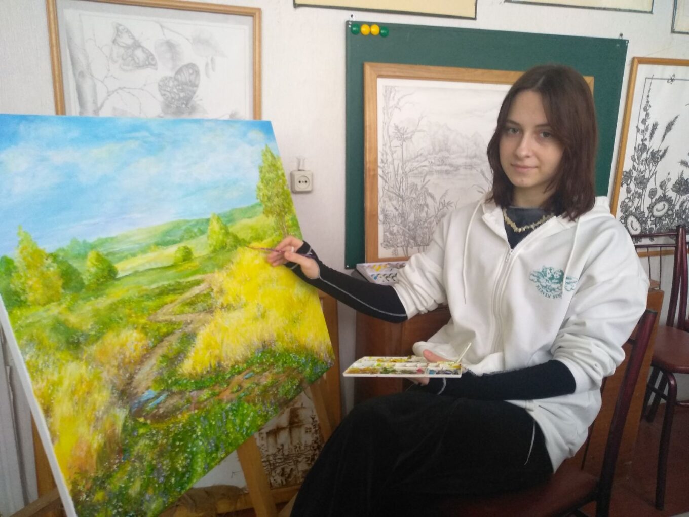 Його Величності подарували картину, намальовану дитиною з України, з виставки, організованої співробітниками задля допомоги благодійній організації Kids and Art for Ukraine.