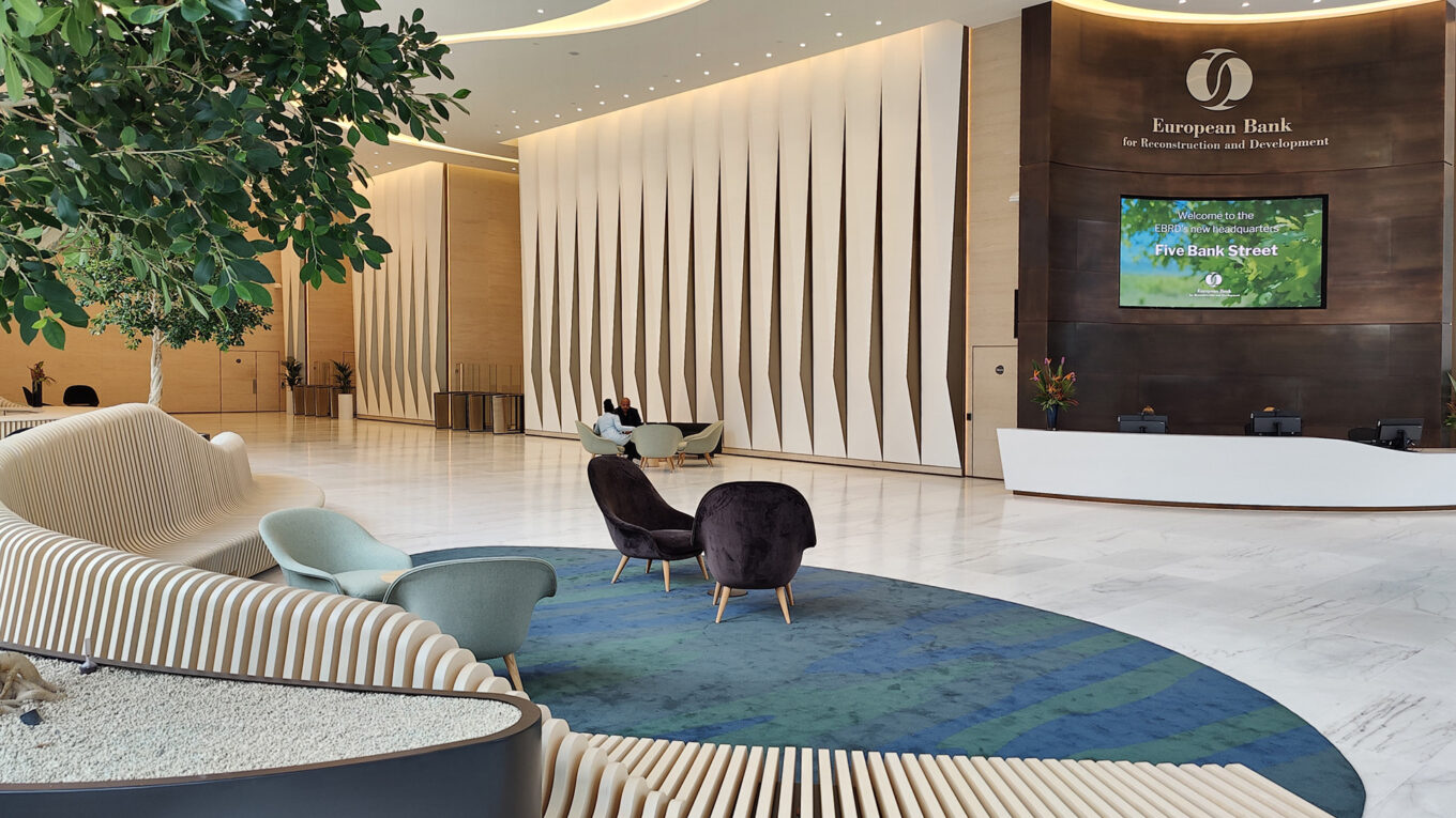 Новий центральний офіс відображає прихильність ЄБРР екологічним цінностям. Нова будівля на Файв-Бенк-стріт була визнана однією з найбільш екологічних та передових у Великій Британії.