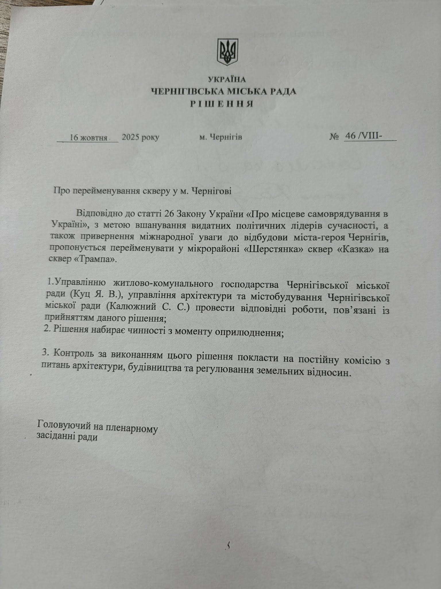 “Це сквер Трампа, а не Дональда Трампа. Ми вважаємо це дипломатичним і політичним кроком, який допоможе привернути міжнародну увагу до Чернігова”, — сказала Семененко.