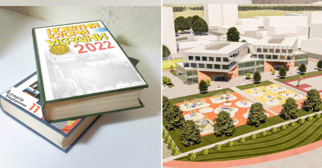 “Ідея образу відновленої майбутньої будівлі школи – це два підручники. Перший – це “Історія України 11 клас” (1-й та 2-й поверхи). Другий – це “Новітня історія України 2022”, який буде видано невдовзі (це 3-й та 4-й поверхи відповідно). Положення підручника “Новітня історія України 2022″ відносно першого, символізує і водночас нагадує нам про той поворот в історії країни, яка змінилась”, – пояснює автор концепту.