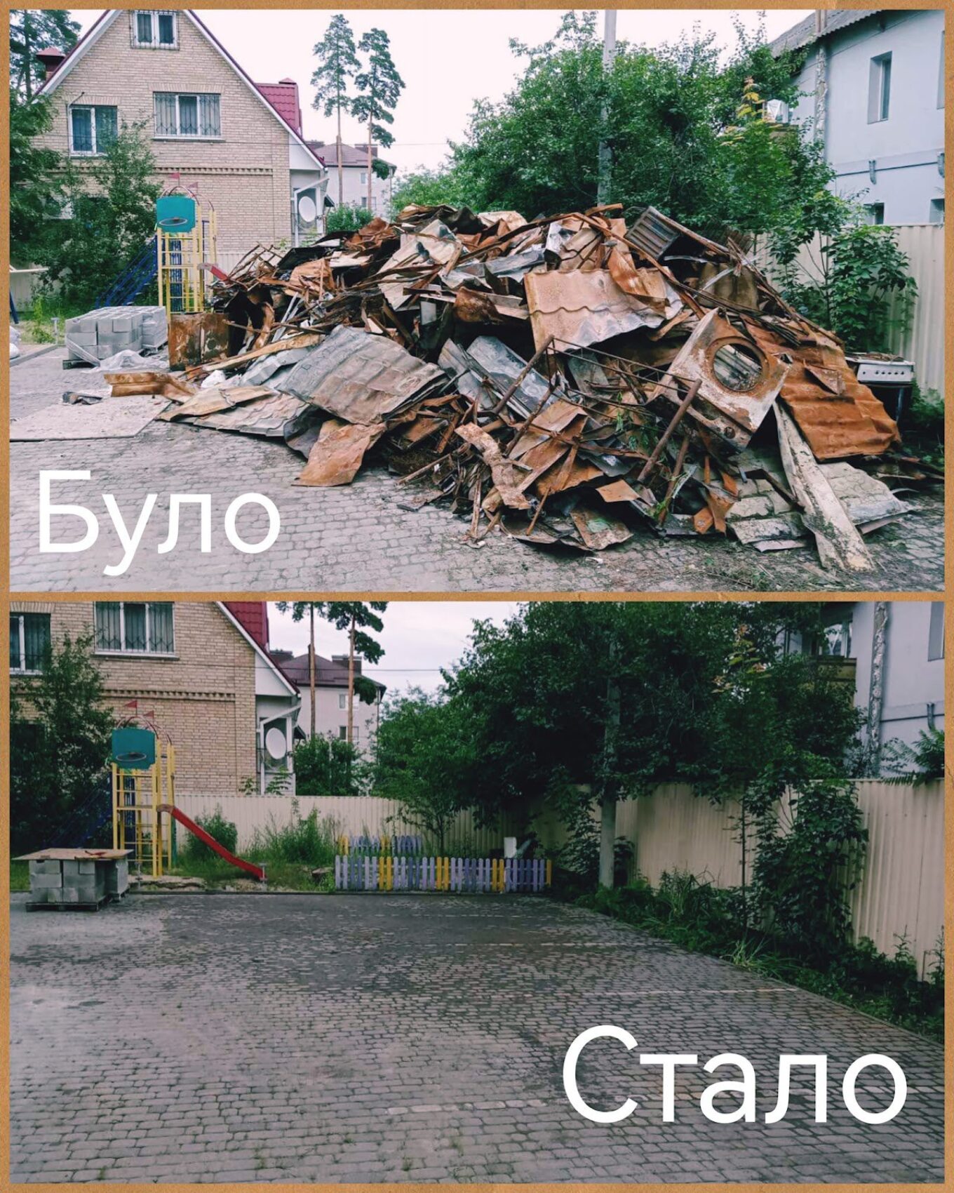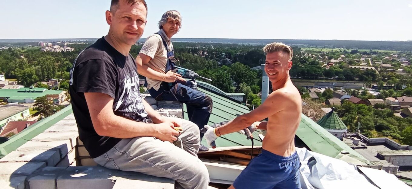 “Наші чоловіки самотужки зробили тимчасове перекриття даху, а також розібрали завали у зруйнованій котельні, навели лад у дворі, полагодили місця прильотів: дитячий майданчик, ворота, паркан, ліфтову секцію”, — розповідає голова ОСББ Оксана Сергієнко.