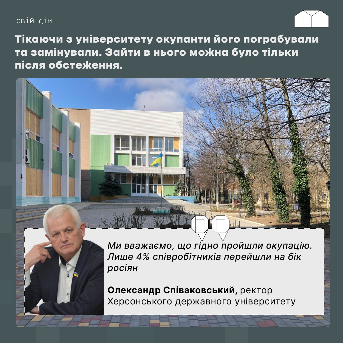 “У такому режимі ми працювали до початку квітня. Потім постало питання, що неможливо державному закладу працювати в окупації. Тоді на рівні конференції трудового колективу ми прийняли рішення переїхати в Івано-Франківськ”, — розповів ректор Херсонського державного університету Олександр Співаковський.