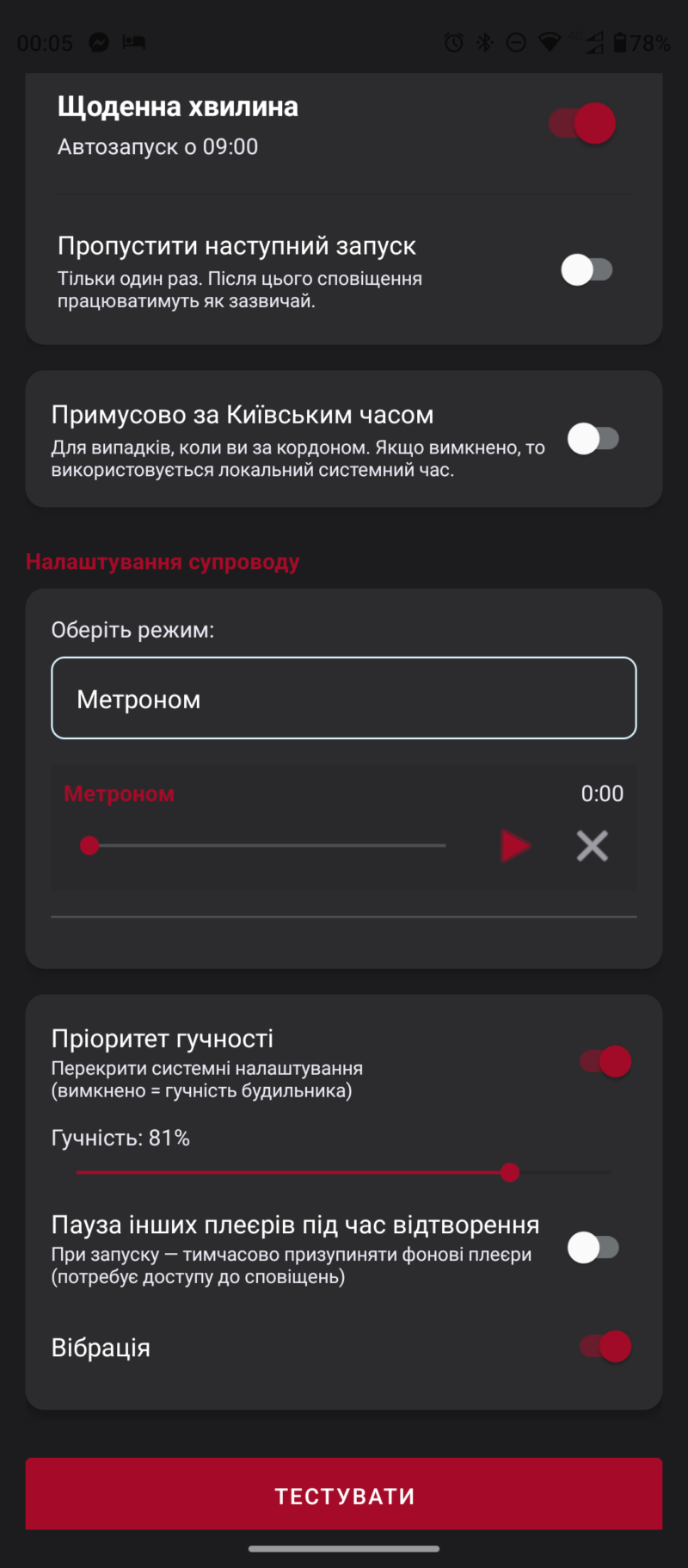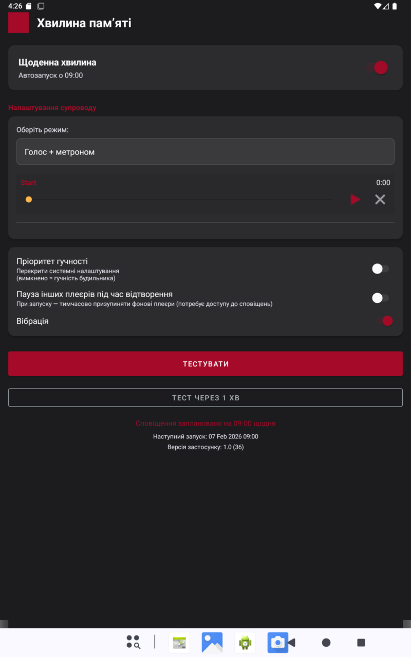 Функцію “Хвилина пам’яті” можна налаштувати під себе. Користувачам доступний вибір звукового сигналу, регулювання гучності, а також опція ввімкнення чи вимкнення вібрації. Передбачено сім форматів сповіщення — зокрема голосове повідомлення, дзвони, метроном, гімн або лише вібрацію без звуку.