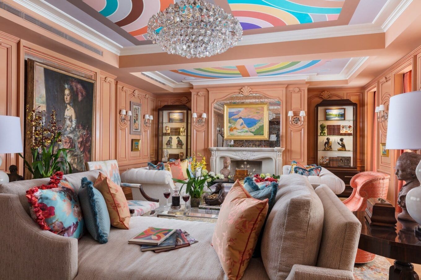 «Я хотела создать место, достойное любителя и ценителя искусства», – говорит Остром о своей столовой, в оформлении которой преобладает розовый цвет. Барбара сочетает антиквариат из Гайд-парка с диванами Кристофера Гая и картинами художников разных периодов. Потолок украшает калейдоскопическая роспись, выполненная Эндрю Тедеско. «Мне удалось создать впечатление, что здесь живет неординарный человек», – считает Остром.