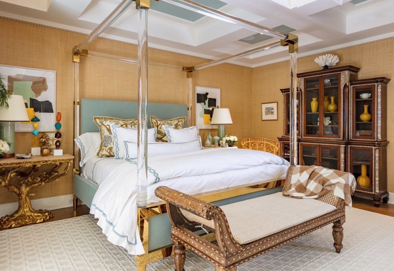 Дизайнер Майкл Герольд: «Моя цель состояла в том, чтобы создать пространство, входя в которое гости уже знали, что в этом доме их ждет что-то потрясающее». Для оформления стен дизайнер использовал мотивы картины XVII века, контрапунктом которой стала литография фовиста Жоана Миро. Античные зеркала добавляют пространству глубину, а полосатая обивка стула и скамьи вносят в интерьер элемент графичности.