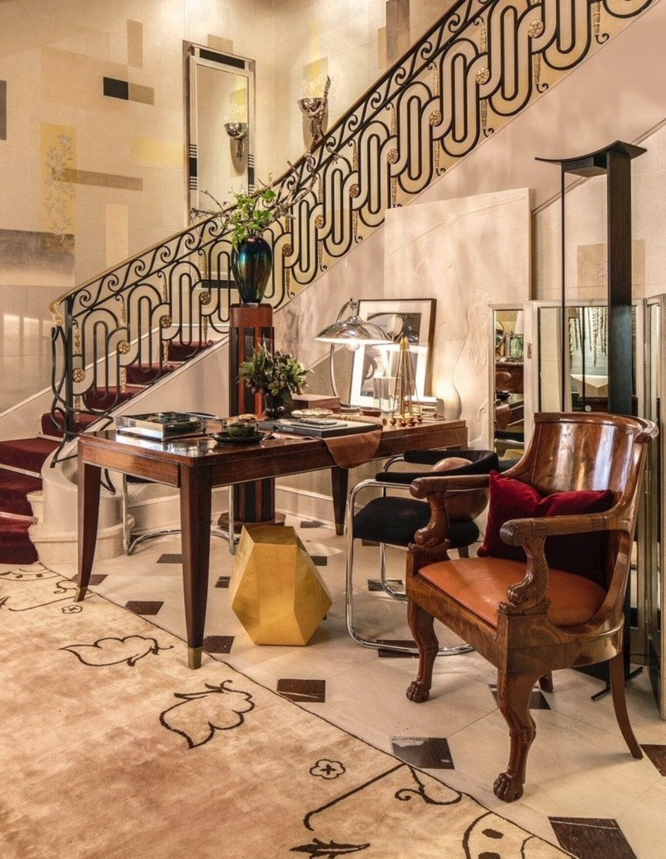 Неоклассическая винтовая лестница с коваными перилами задавала характер этому помещению. Дизайнеры решили подчеркнуть ее достоинства с помощью ковра от Дорис Лесли Блау, антикварной мебели и плиты с барельефом богини Дианы из антикварного бутика Newel. «Она покровитель этого пространства, – смеется Дин Финк. «Поэтому я хотел, чтобы все это выглядело элегантно, но мощно».