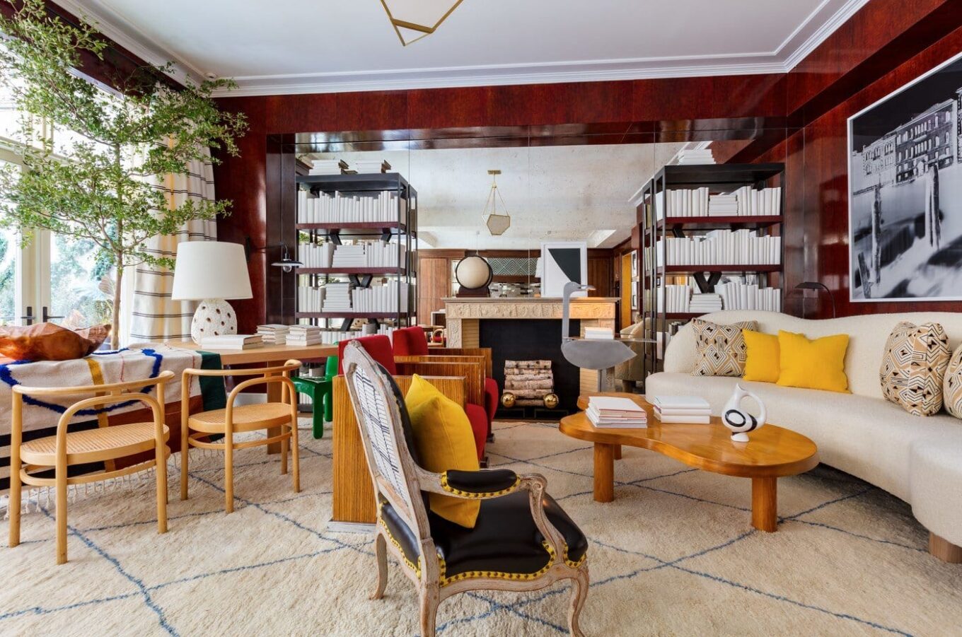 Доминирующим цветом для гостиной Дэвид Нетто выбрал красный. «Нью-Йорк, в котором я вырос, был полон красных комнат, – вспоминает он, – Там была знаменитая библиотека Брук Астора и невероятная комната Марио Буатты – это было в 1980 году, в доме Кипс-Бей». В своем проекте Нетто интегрировал этот винтажный оттенок в современную обстановку, добавив многочисленные предметы декора, и большое количество книг. «Я хотел вспомнить все красные комнаты, которые так много значили для меня, творения декораторов, которыми я восхищаюсь, и попытался использовать их в собственной истории».