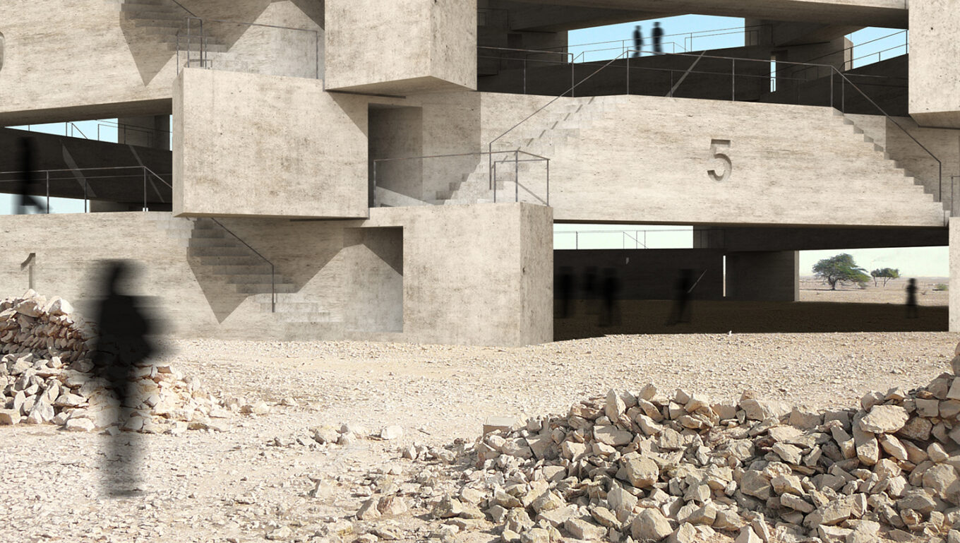 Меморіал – небосяг, складений з бетонних модулів. Кожен з блоків символізує окремого загиблого працівника, відповідно, й сама вежа збільшуватиметься пропорційно до кількості померлих на будівництві.