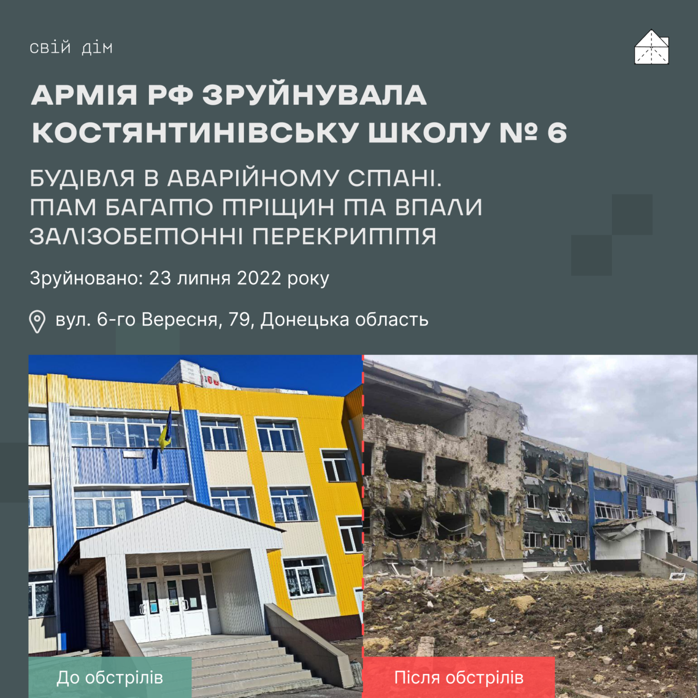“У Костянтинівці із 17 закладів освіти російські обстріли зруйнували 15. Серед них і школа № 6. Зараз будівля знаходиться в аварійному стані”, — розповів журналістці “Свій дім” директор Олександр Резніченко.