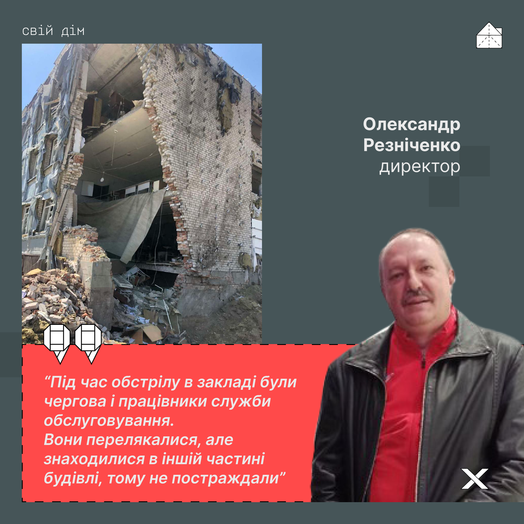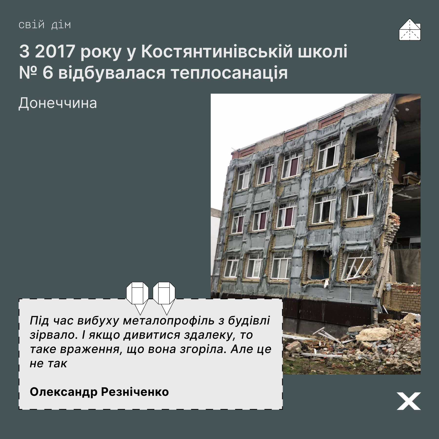 “У Костянтинівці із 17 закладів освіти російські обстріли зруйнували 15. Серед них і школа № 6. Зараз будівля знаходиться в аварійному стані”, — розповів журналістці “Свій дім” директор Олександр Резніченко.