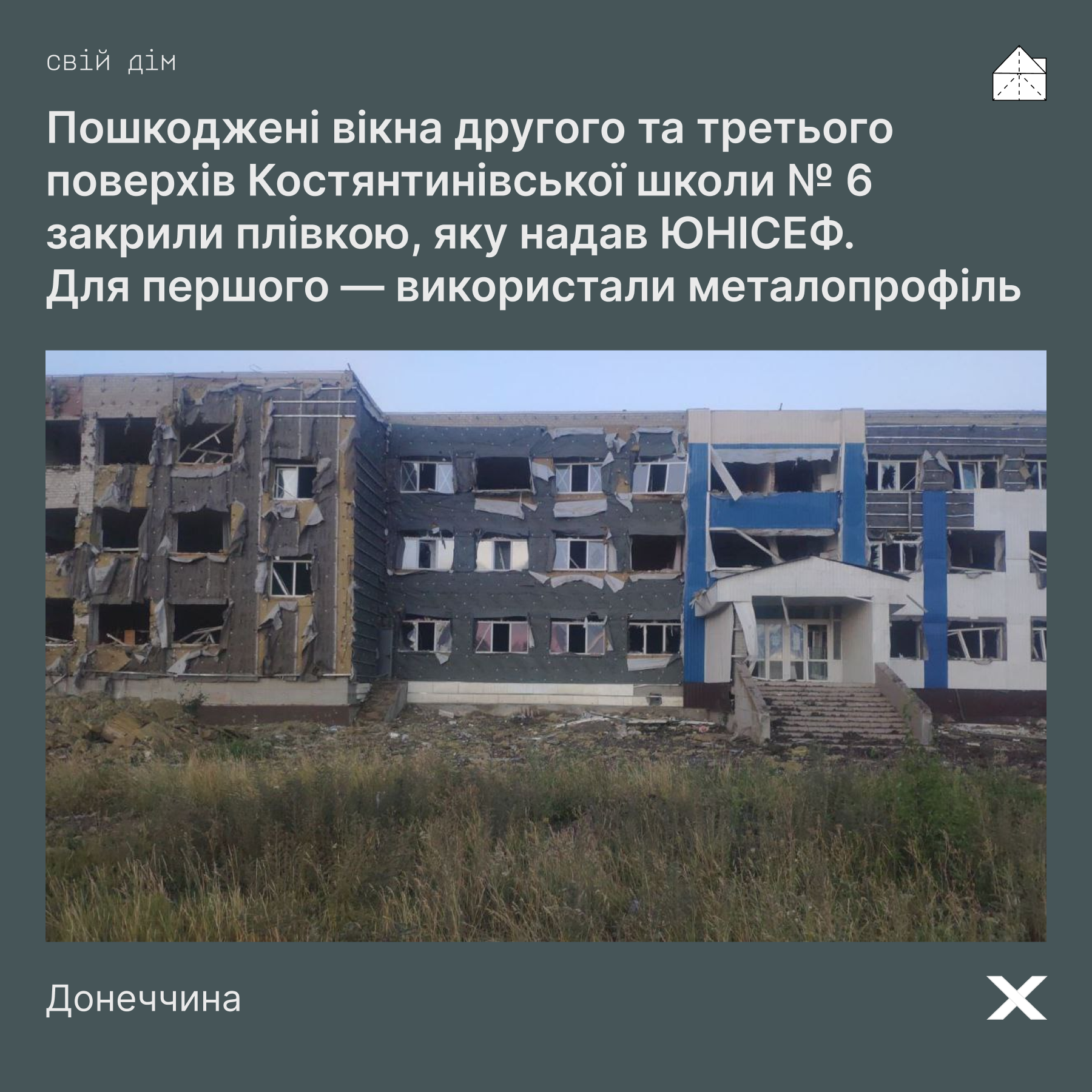 Костянтинівську школу № 6 обстріляли декілька разів. Перші снаряди поцілили на подвір’я. Тоді від вибухової хвилі повилітали вікна та двері в кабінетах.