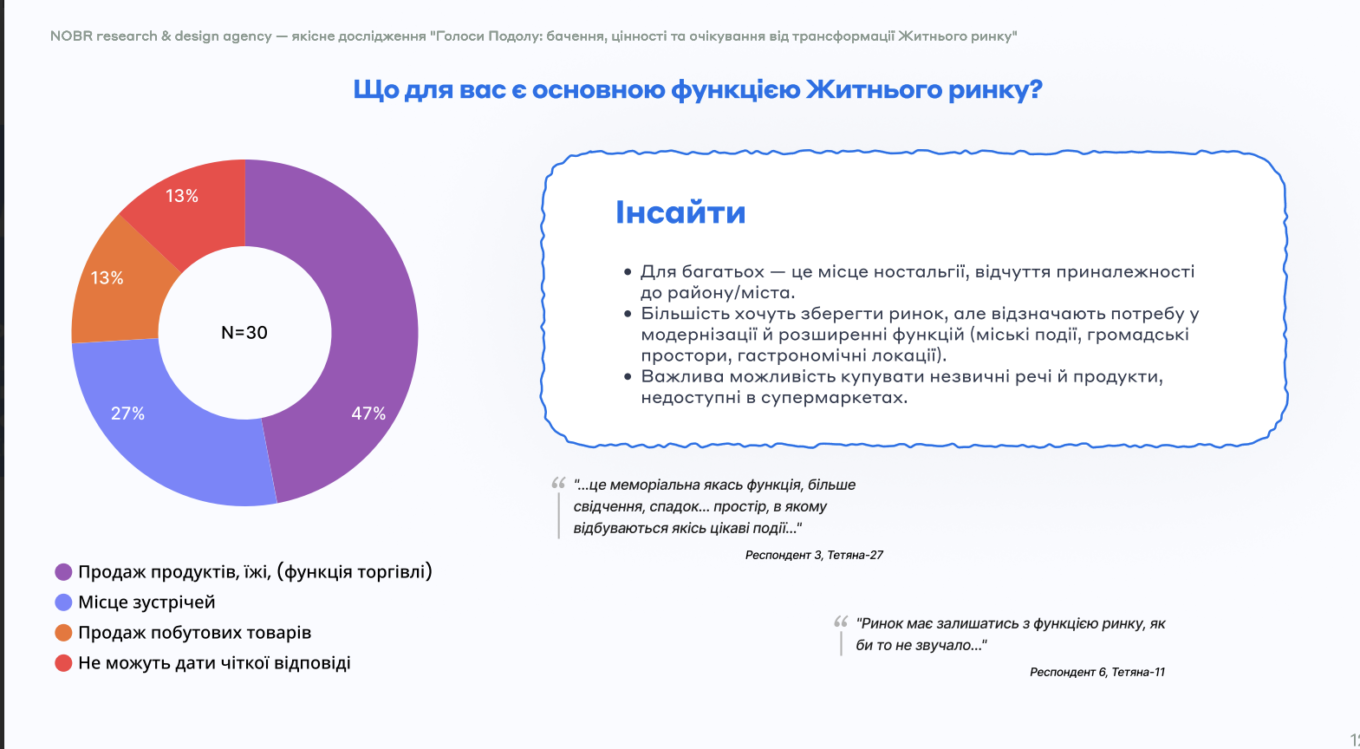 У відповідь на ці виклики Nobr research & design agency за участю волонтерів провела комплексне якісне дослідження “Голоси Подолу”, щоб зафіксувати позиції мешканців району, постійних відвідувачів і працівників Житнього ринку.