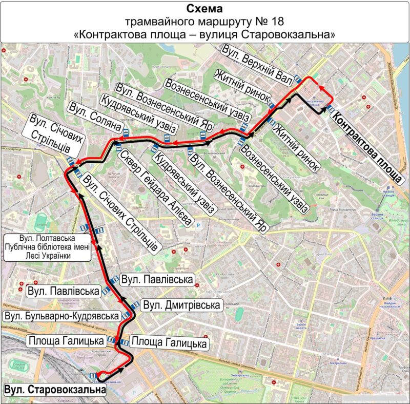 трамвай № 18 «Контрактова площа – вулиця Старовокзальна»;