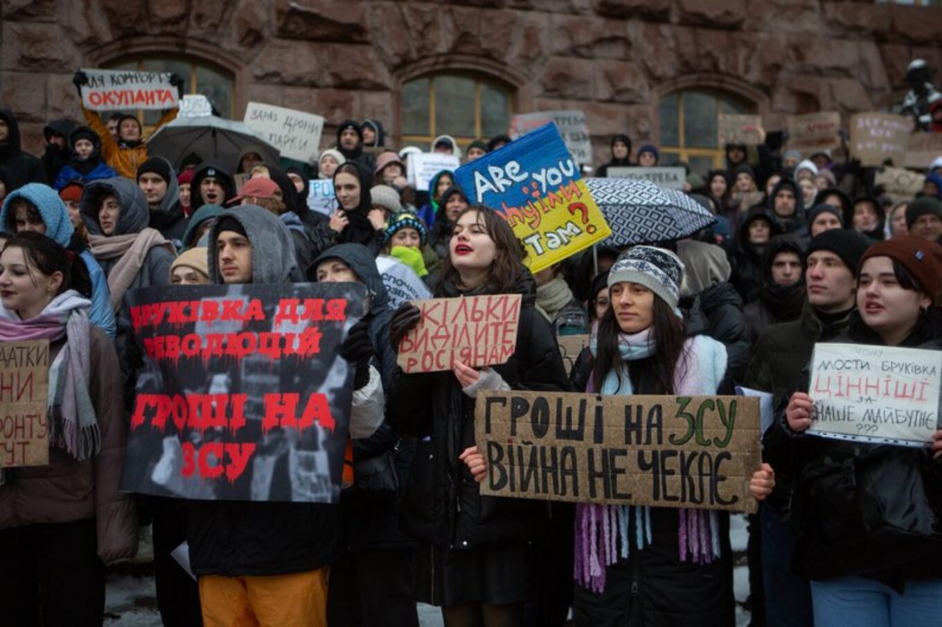 Акція біля КМДА. Люди вимагають змінити бюджетні витрати на користь ЗСУ, 14 грудня 2023 року. Фото: Олександр Магула/Суспільне