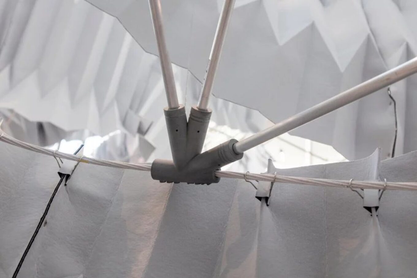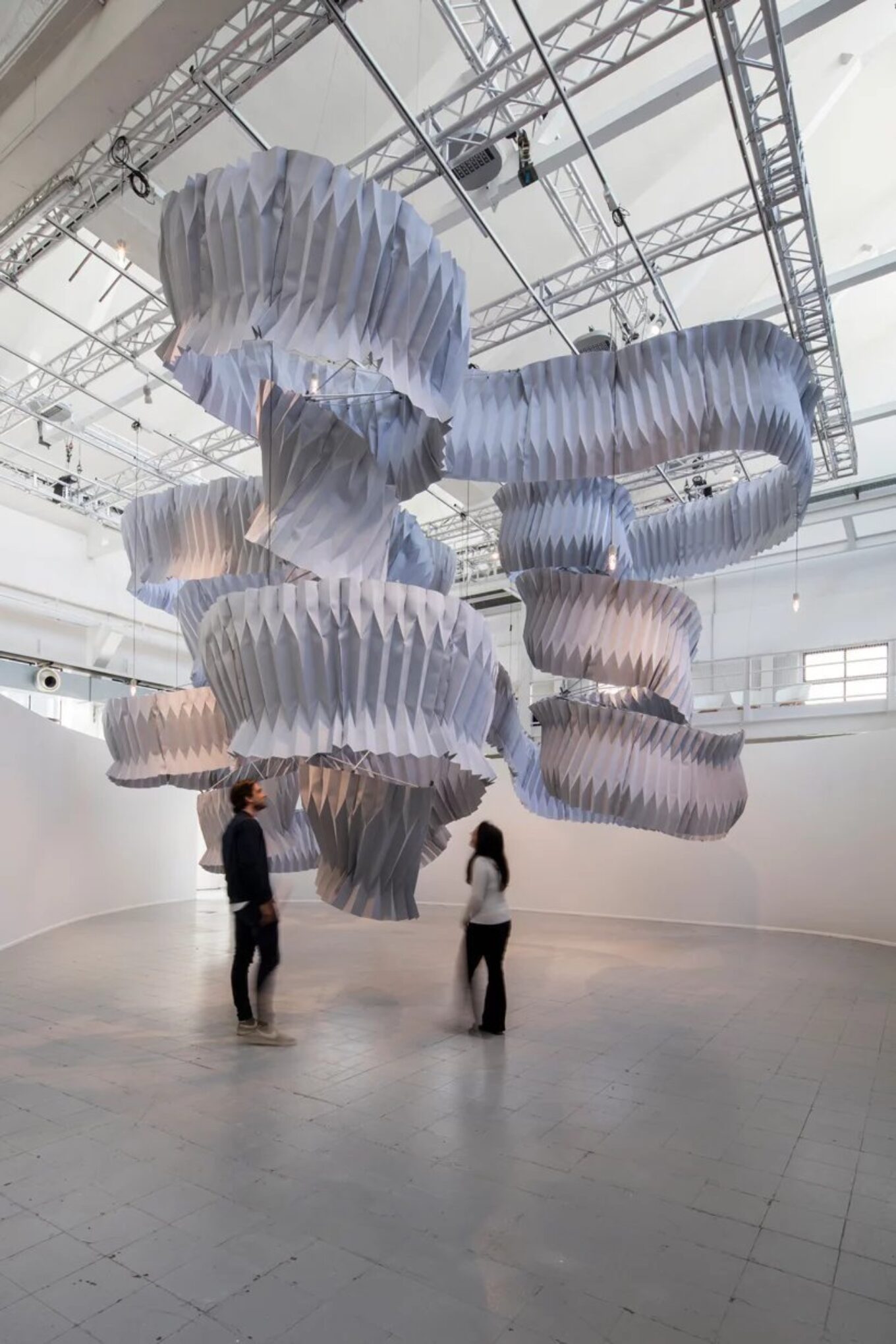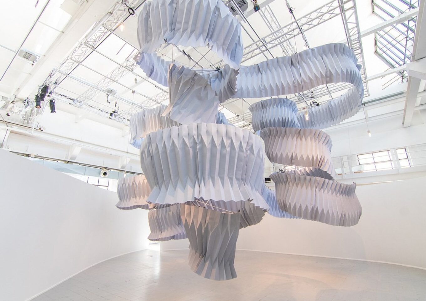 Кенго Кума вручную сложил текстиль в технике оригами, а затем нанизал элементы на спиральный стержень из углеродного стекловолокна. Между собой фрагменты скреплены 46-ю суставами, распечатанными на 3D-принтере. Скульптура высотой 6 метров была подвешена к потолку – она напоминает гигантский мобиль.