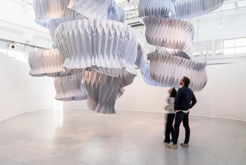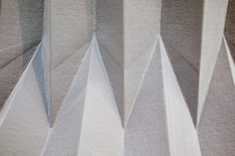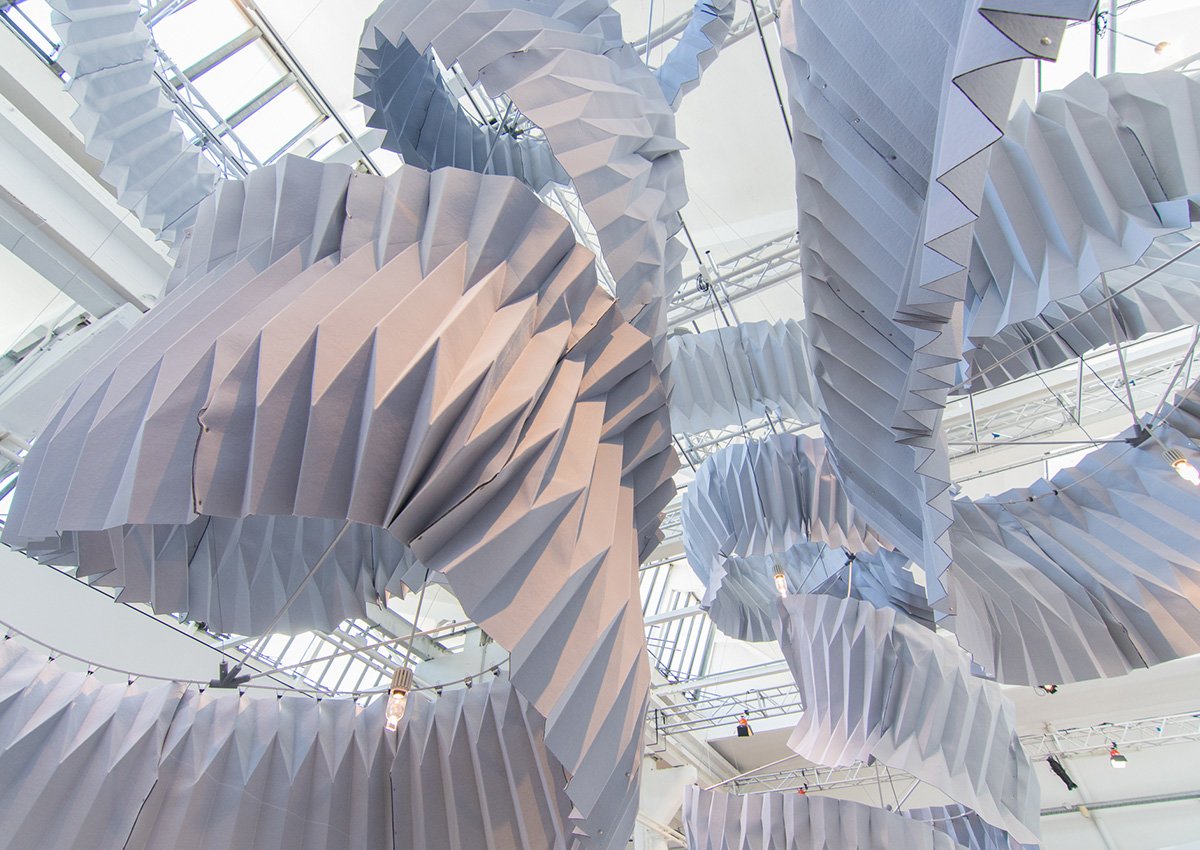 Кенго Кума вручную сложил текстиль в технике оригами, а затем нанизал элементы на спиральный стержень из углеродного стекловолокна. Между собой фрагменты скреплены 46-ю суставами, распечатанными на 3D-принтере. Скульптура высотой 6 метров была подвешена к потолку – она напоминает гигантский мобиль.