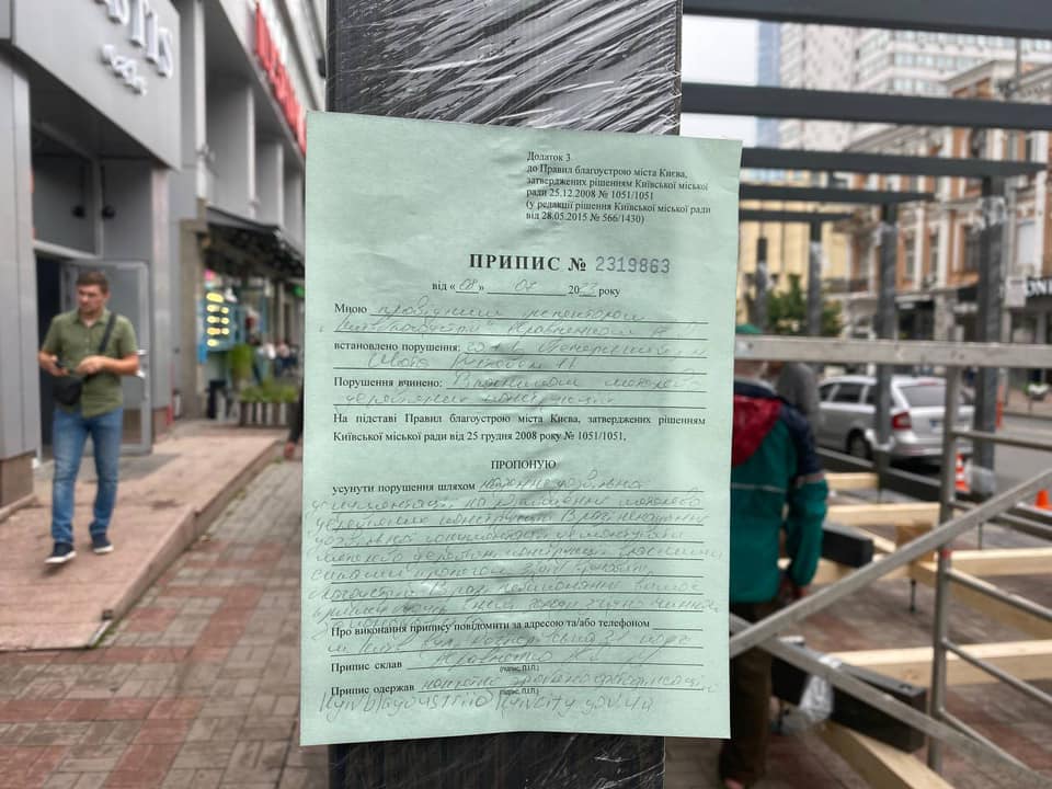 “Роботи зупинені. Інспектор вручив припис з вимогою демонтувати обʼєкт. Власника на місці не було, робітники показали договір на літній майданчик без конструктивних елементів”, – написав Буділов в коментарях до публікації депутатки Київради Ксенії Семенової у фейсбуці.
