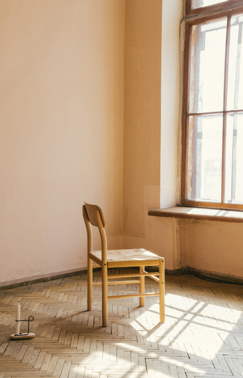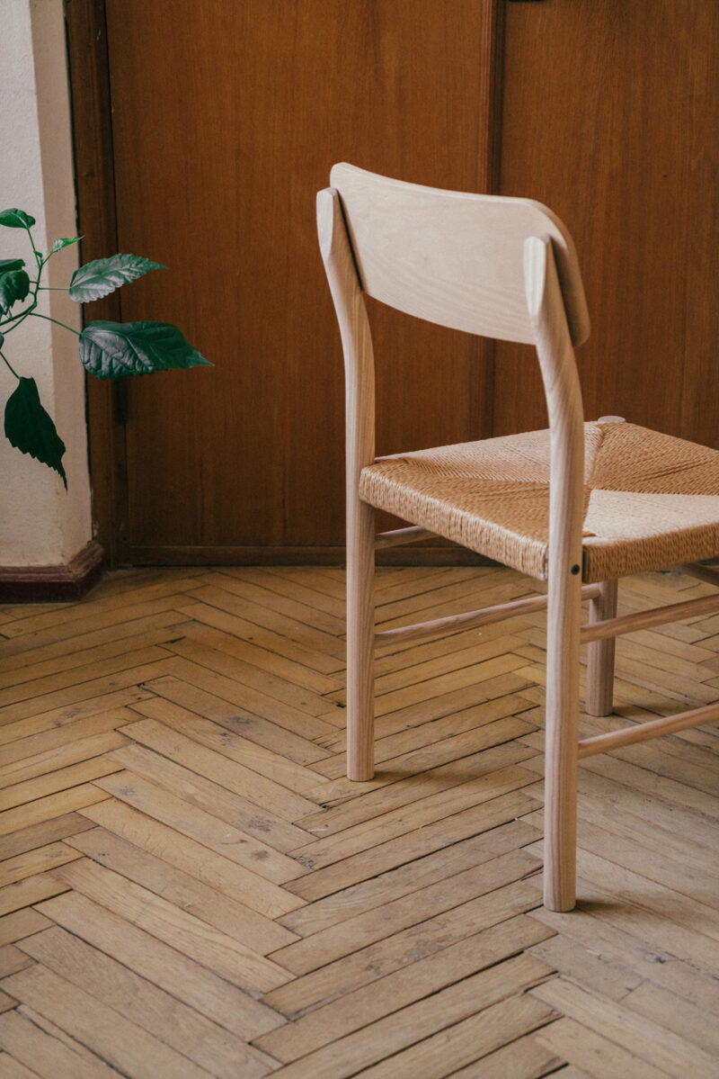 Повністю розбірний і компактний у логістиці стілець пропонує тактильне поєднання плавних ліній теплого дерева та паперового шнурка.