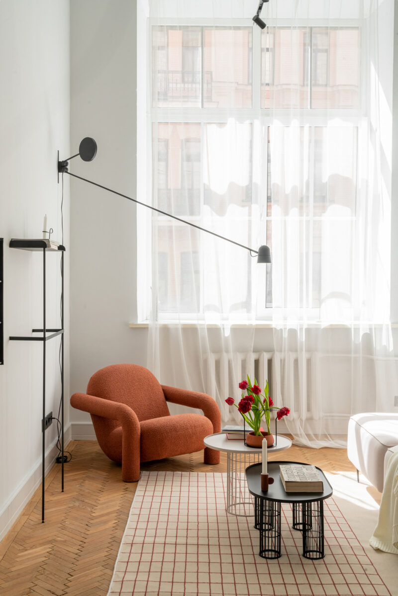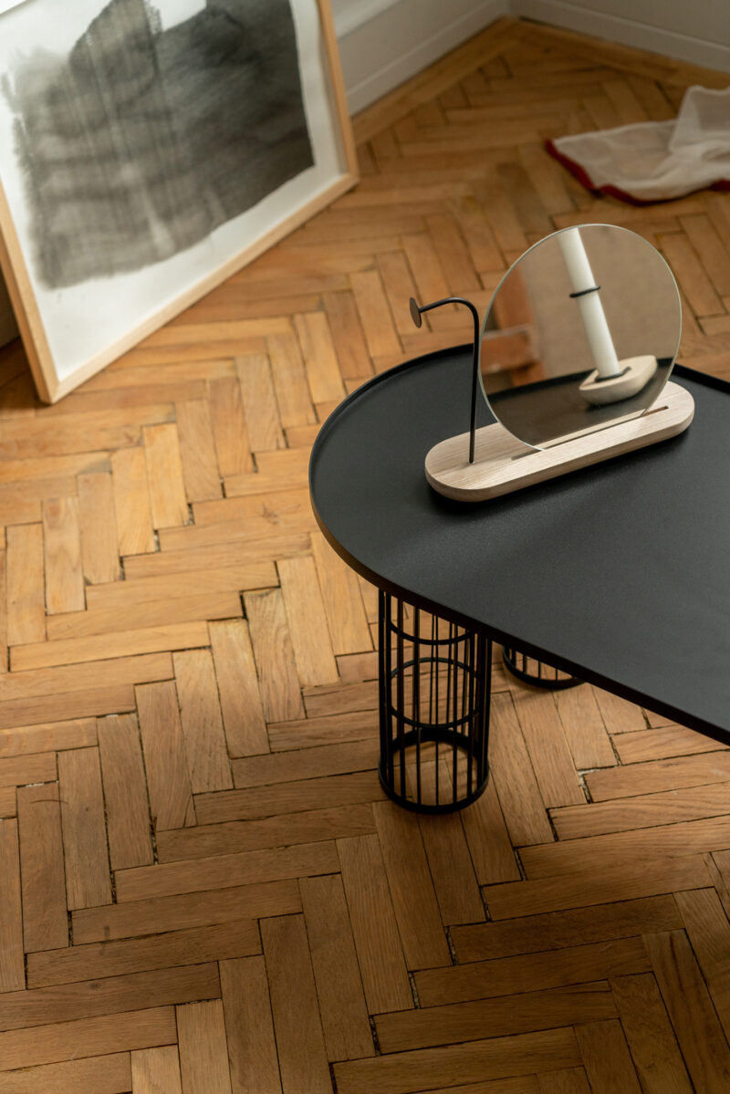 Шпоновані деревʼяні поверхні поєднані з чорним матовим металом, скляні вази з гутного скла для квітів з тонкими контурними опорами, прозорі дзеркала з ефектами тіні в повітрі.