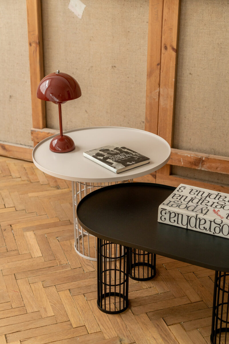 Серія кавових столиків доступна в чорному та бежевому кольорі металу та може бути доповнена стільницею з 6 мм керамограніту Calacatta. Каркасні витончені ніжки додають повітря усій конструкції.