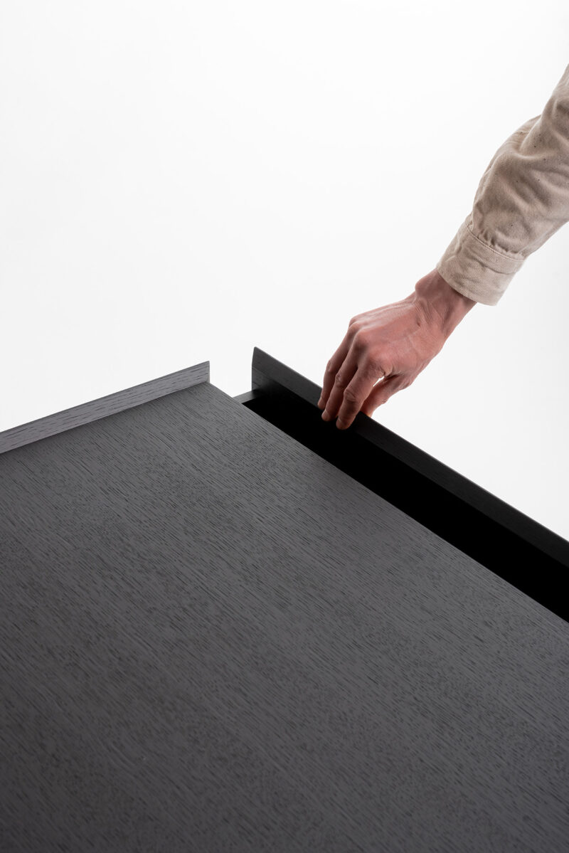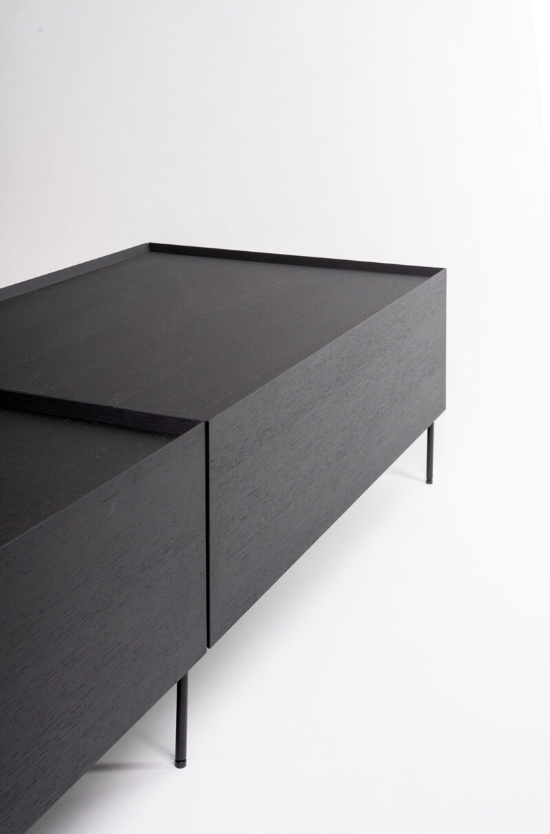 Фасад тумби під телевізор виконаний з натурального шпону під глибоко чорним матовим лаком, що надає їй особливих тактильних відчуттів. Філігранна геометрична конструкція доповнена тендітними металевими ніжками, схожими на жіночі підбори, що регулюються.