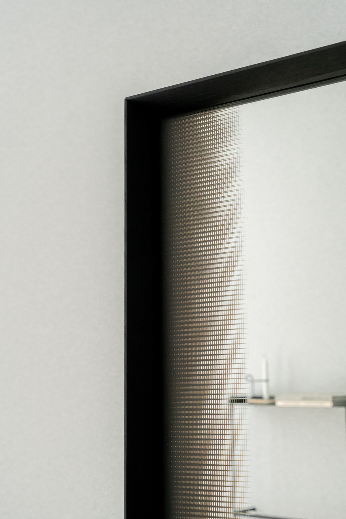 Шпоновані деревʼяні поверхні поєднані з чорним матовим металом, скляні вази з гутного скла для квітів з тонкими контурними опорами, прозорі дзеркала з ефектами тіні в повітрі.