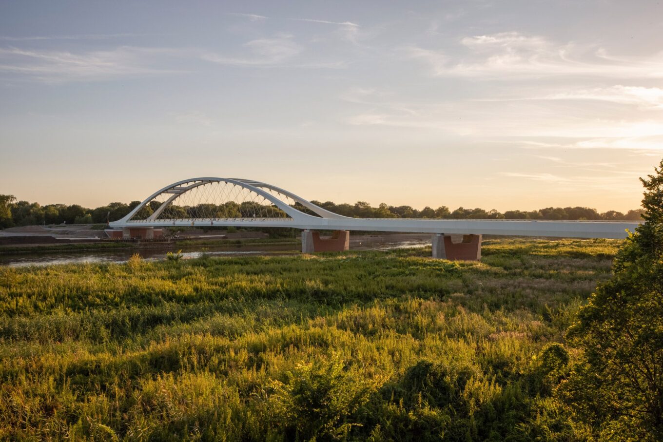 130-метровий міст, обрамлений білими сталевими арками та міцною решіткою з армованого вуглецевим волокном пластику (CFRP), відновлює історичне залізничне сполучення між двома країнами.