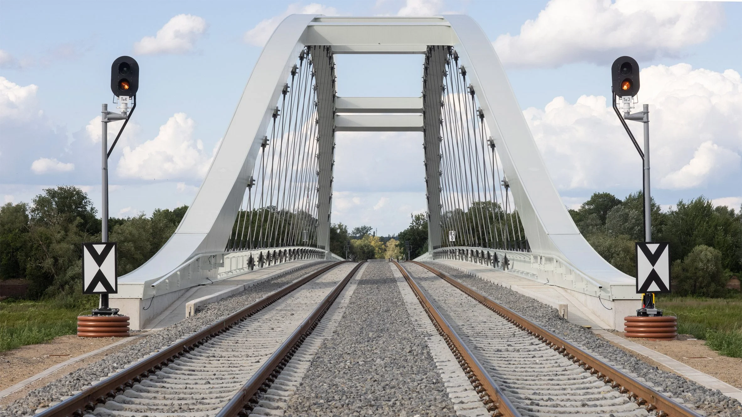 130-метровий міст, обрамлений білими сталевими арками та міцною решіткою з армованого вуглецевим волокном пластику (CFRP), відновлює історичне залізничне сполучення між двома країнами.