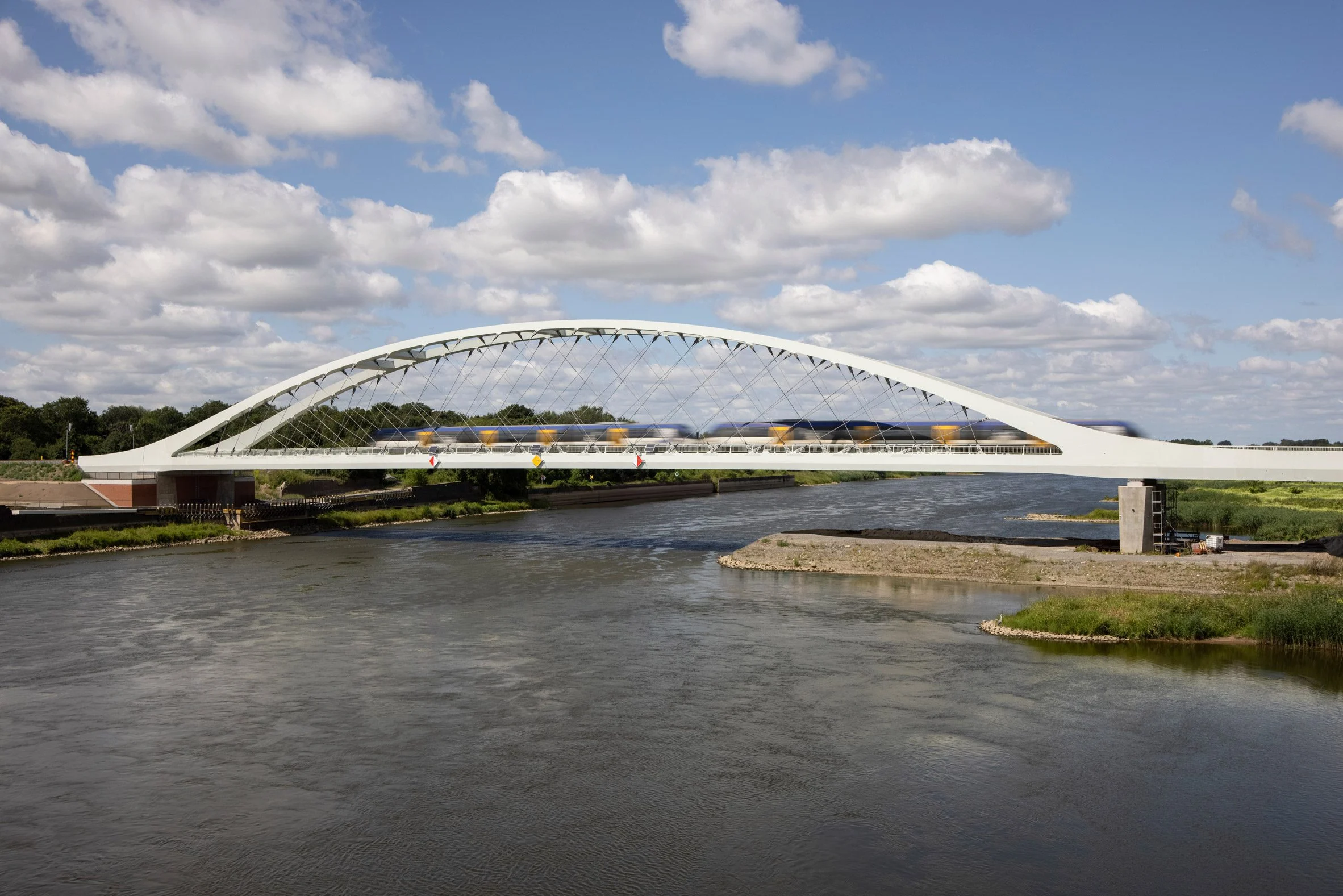 Цегляні та бетонні пірси підтримують міст на березі річки, тоді як центральний проліт підтримується арками з білої сталі.