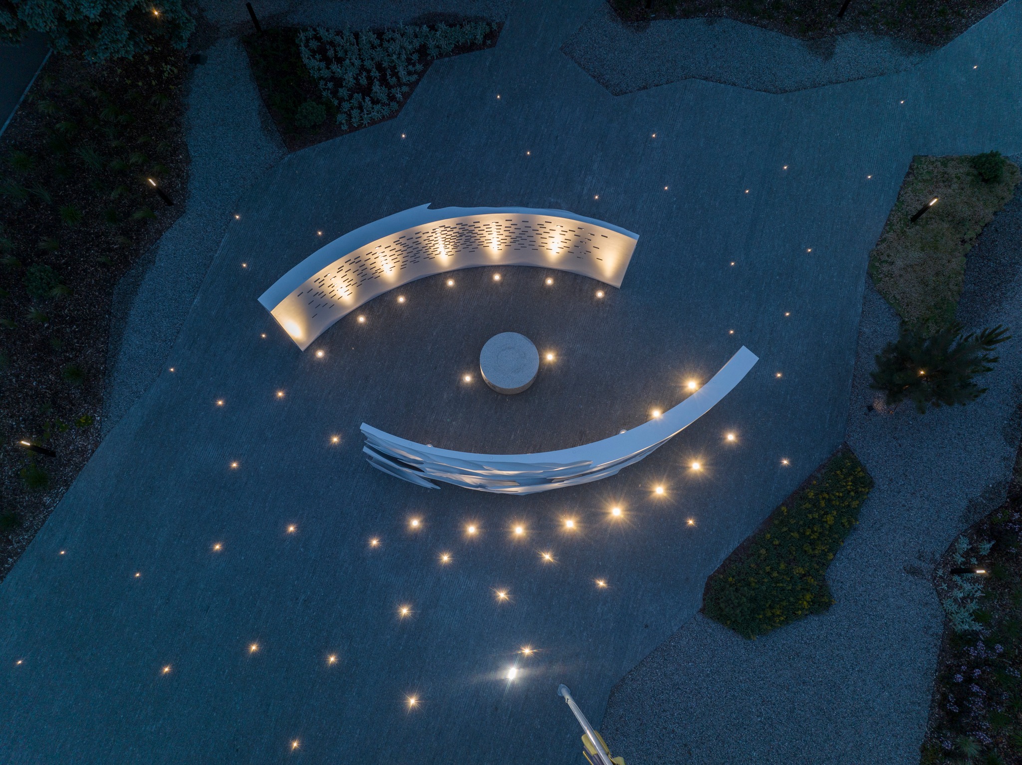 Якщо подивитися на меморіал зверху, його форма нагадує око – символ пильності, непомітної, але постійної присутності. Це символічне рішення підкреслює неперервний нагляд та захист, який забезпечує розвідка. Коло в центрі — символ вічності — слугує місцем для покладання квітів.
