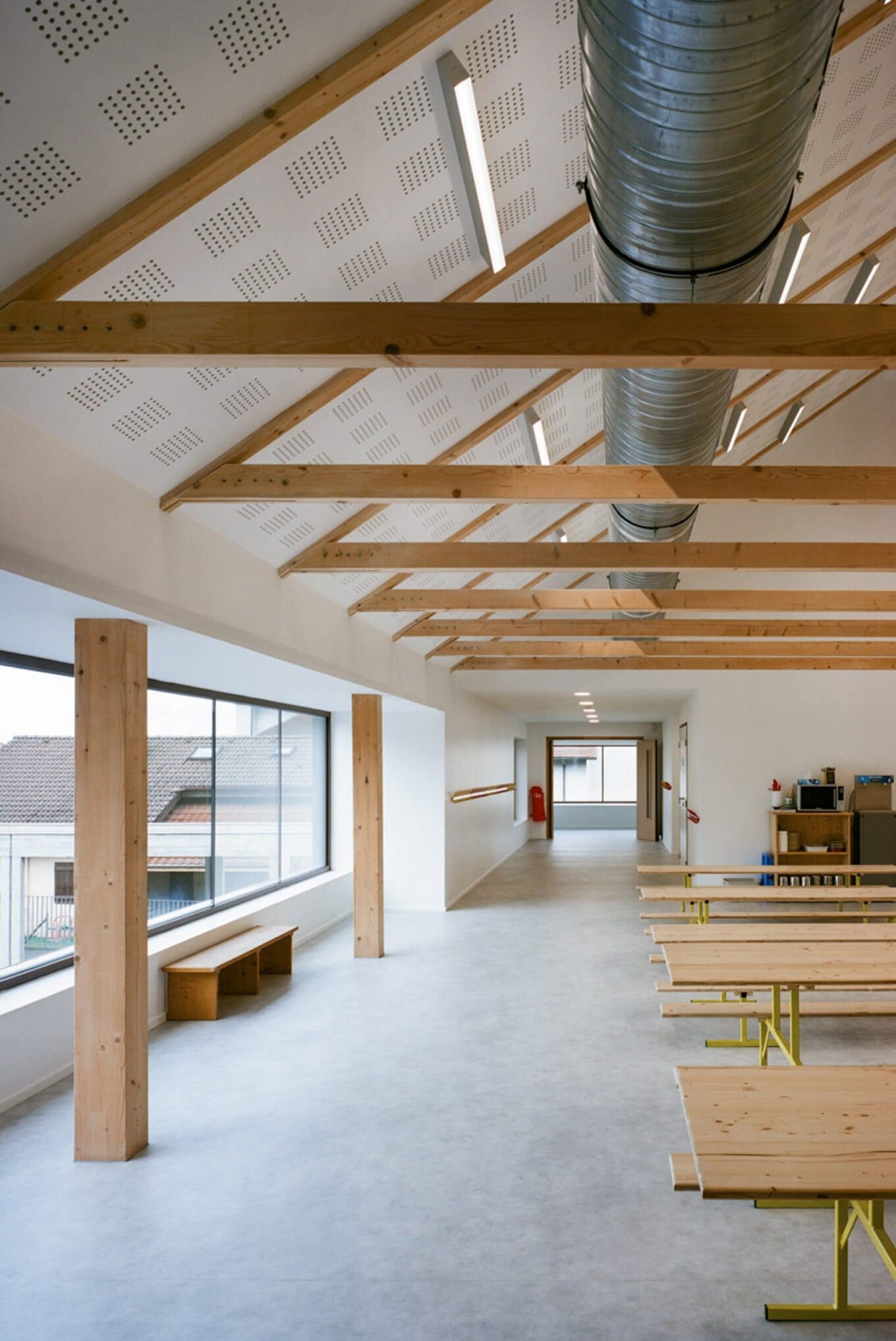 Начальная школа представляет собой двухэтажное здание в форме сельскохозяйственного ангара. На первом этаже расположены четыре учебных класса, а на втором – столовая, которая может использоваться как зал для проведения праздничных мероприятий или лекторий.
