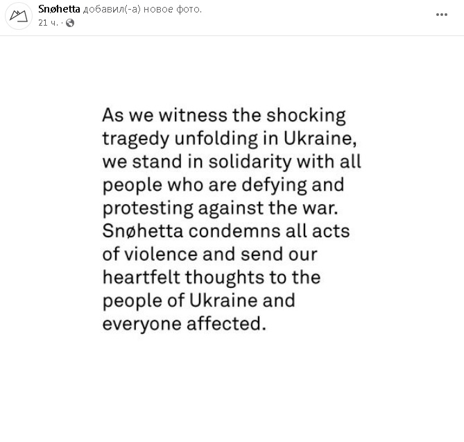 Також архітектурне бюро Snøhetta висловило свою солідарність українському народові у війні з росією.