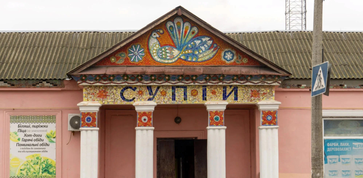 Мозаїка “Птах” розміщена на фронтоні ресторану “Супій” в Гельмязові, на Черкащині. Її створили шістдесятники Алла Горська та Віктор Зарецький.