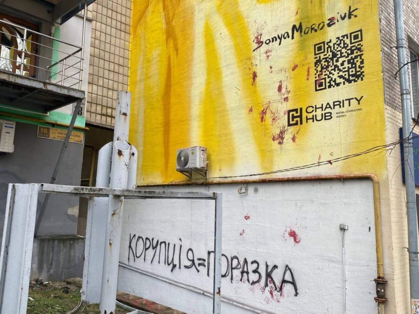 Ще один мурал, що розташований на фасаді будинку по вул. Мечникова, 16 у Києві невідомі облили червоною фарбою, пише Суспільне. Крім того, під картиною з’явився підпис: “Корупція = поразка”.
