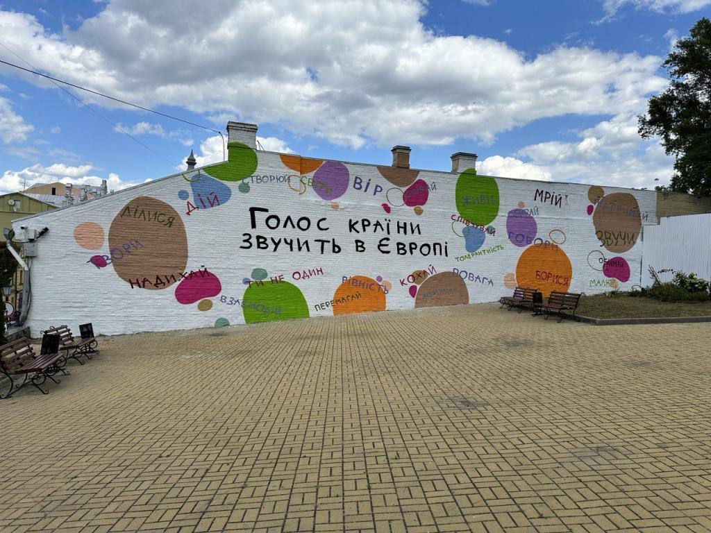 Один з муралів, що розташований на Андріївському узвозі, замальовують за наказом Подільської районної адміністрації. Стінопис створено у співпраці проєкту “Голос країни”, який мотивує українців жити під час війни.