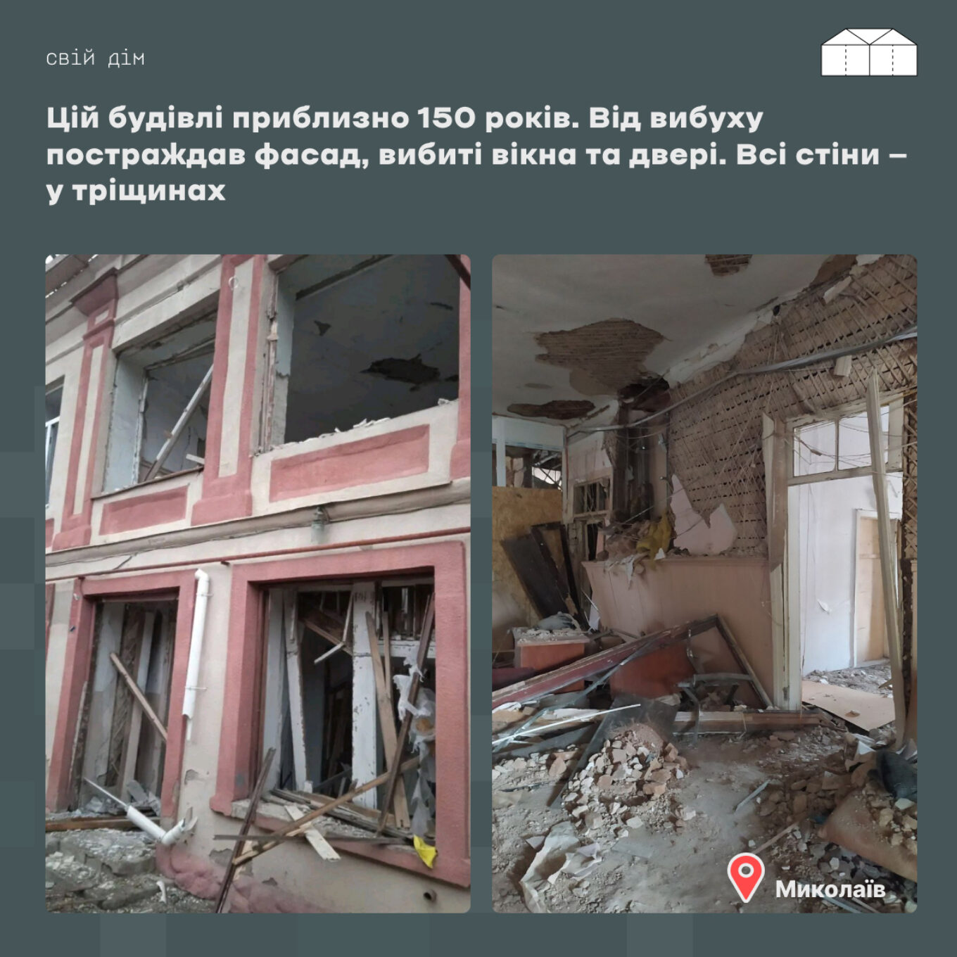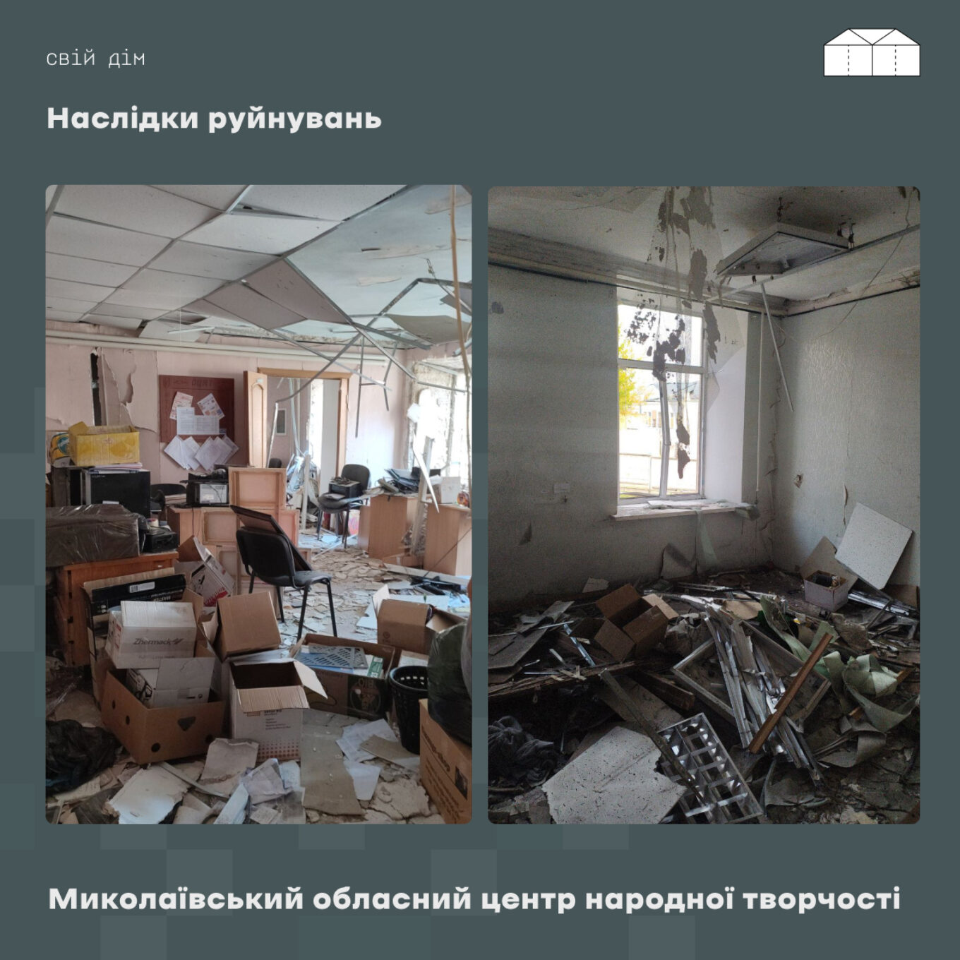 “Коли прийшли вранці, то побачили, що стін немає, даху немає, балки попадали. Було зрозуміло, що рятувати вже нічого. На столах, підлозі — всюди цегла. Важко було щось знайти. Винесли частину документації, колеги допомагали все вивозити”, — розповіла журналісту “Свій дім” Наталія Баштова, директорка Миколаївського обласного центру народної творчості, Заслужена артистка України.
