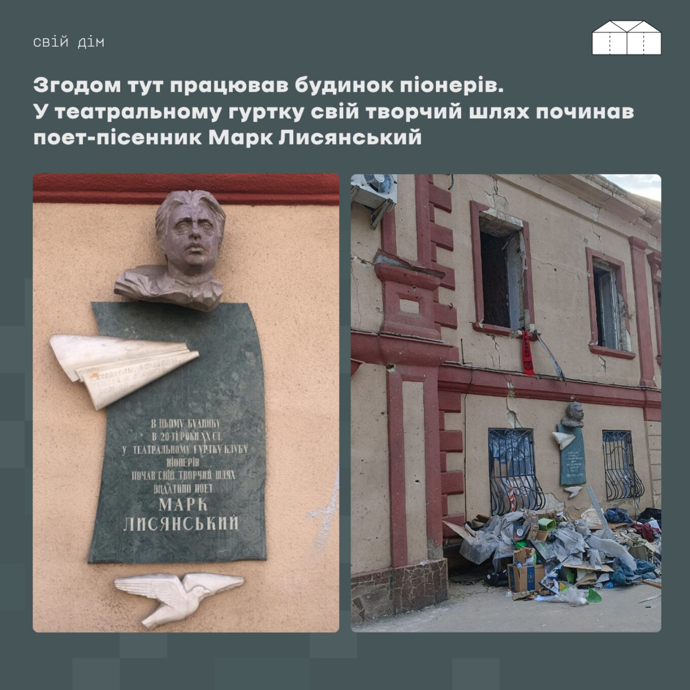 У 20-х роках там був клуб піонерів, де працював театральний гурток. Ще школярем його відвідував Марк Лисянський. Меморіальна дошка з барельєфом поета-пісенника прикрашала фасад з 2003 року.