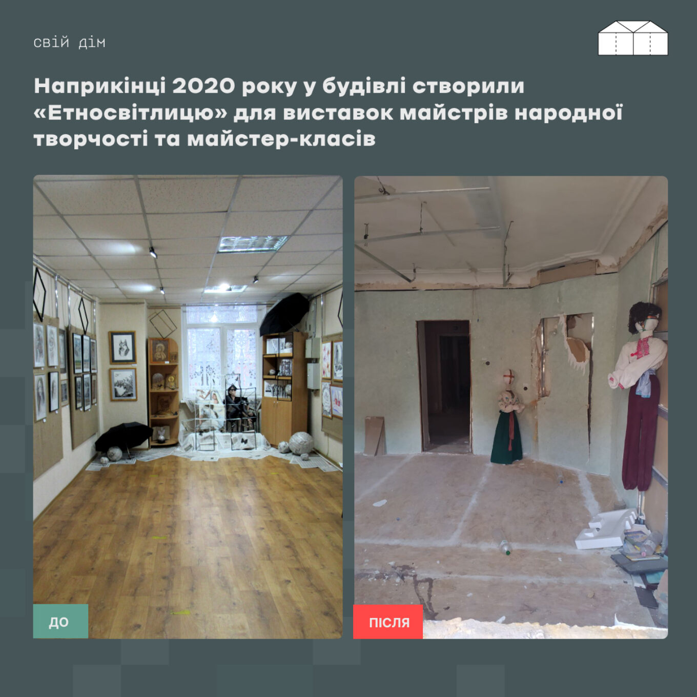 “У зруйнованій будівлі наш центр творчості займав практично весь перший поверх і частково другий. Були кабінети методистів, “Етносвітлиця”, де проводили виставки і майстер-класи”, — розповіла Галина Стрелецька, провідний методист по вокально-хоровому жанру.